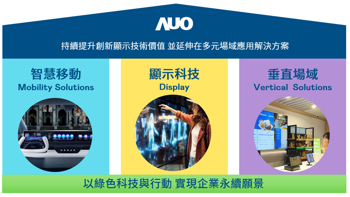 我們持續推動「雙軸轉型」,在精進顯示技術附加價值(Go Premium),與深化垂直市場應用(Go Vertical)的策略下,對應AG旗舰厅的優勢競爭力與趨勢,我們奠定顯示技術智慧移動垂直場域三大永續營運支柱,在顯示技術領域的根基之上,延伸布局多元場域應用解決方案。將先進顯示科技助力智慧移動及垂直場域發展,並以綠色科技與行動為實踐,在轉型之路上貫徹永續經營之願景。
